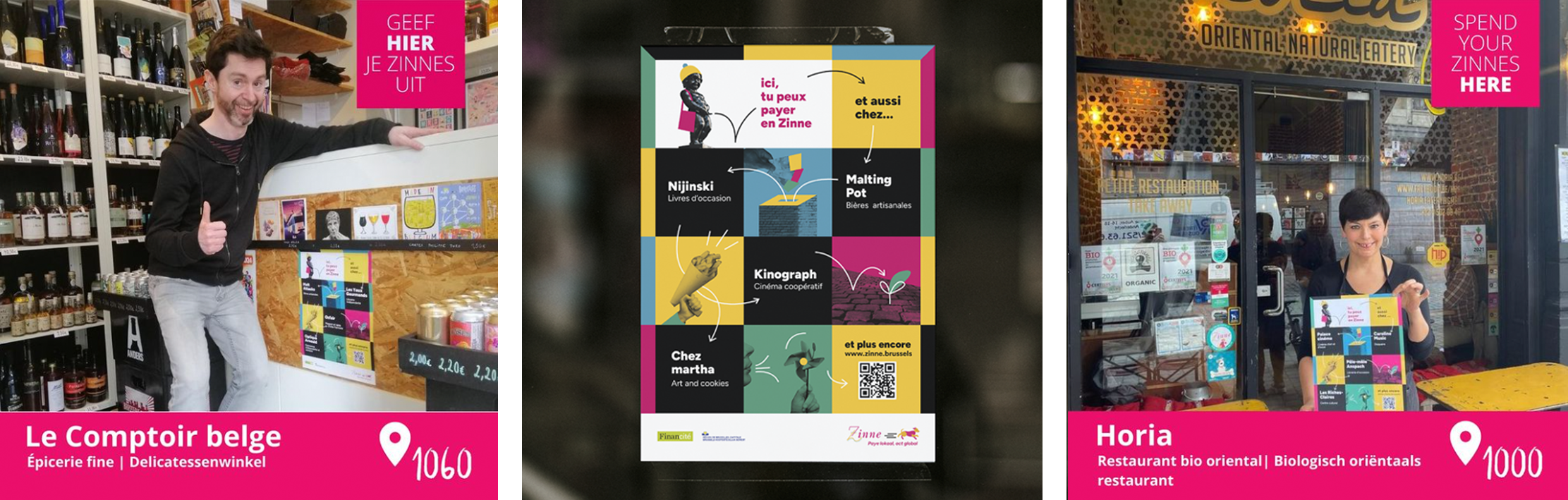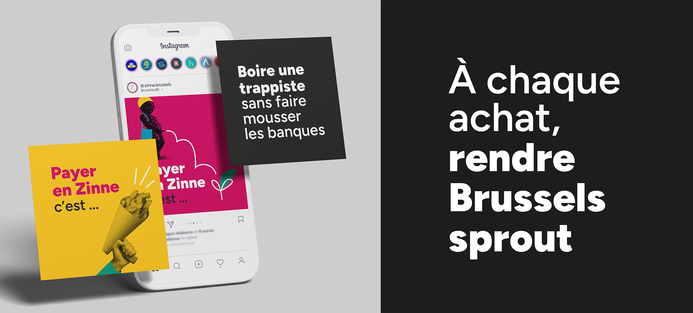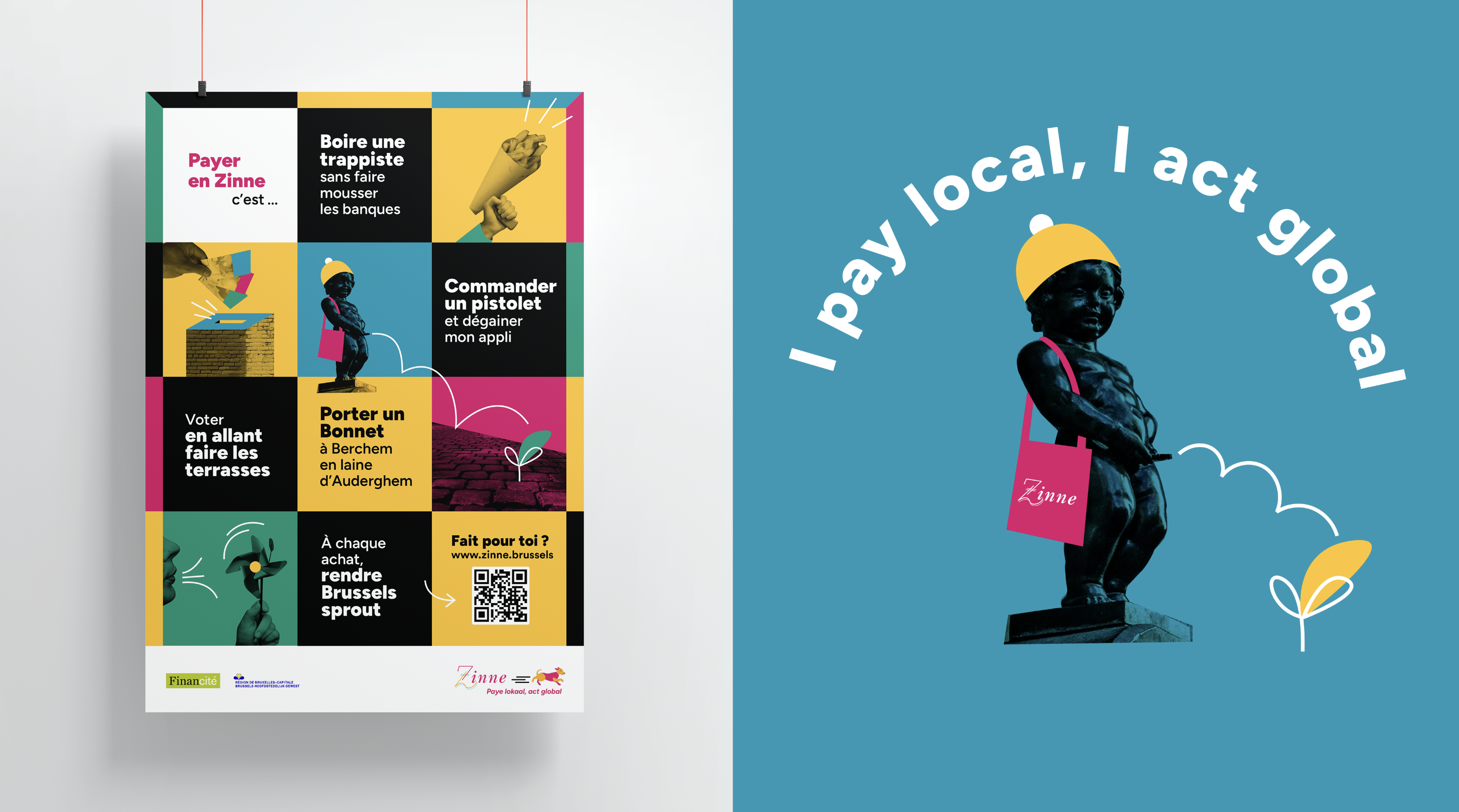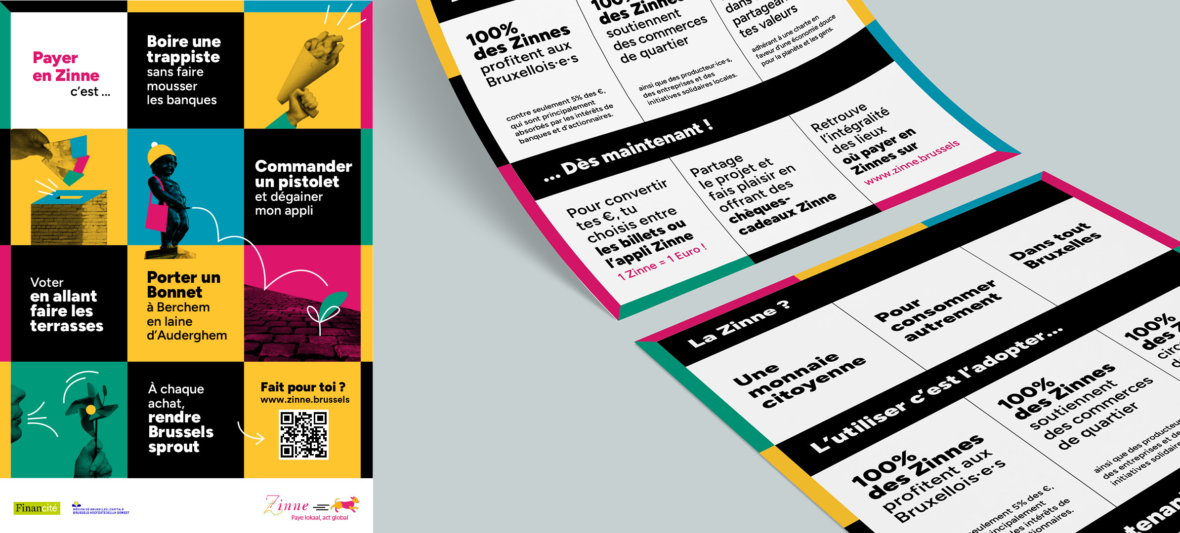 La Zinne asbl promotes Brussels very own local currency, La Zinne! They wanted a fresh look to highlight the playful and feel-good aspects of their project to encourage the people of Brussels to engage with its currency. Our task involved creating a general poster introducing the local currency, a trilingual (FR, NL, EN) flyer explaining the benefits of La Zinne, a poster for Brussels retailers to present the network, stickers, a T-shirt design, and Canva templates for social media posts.